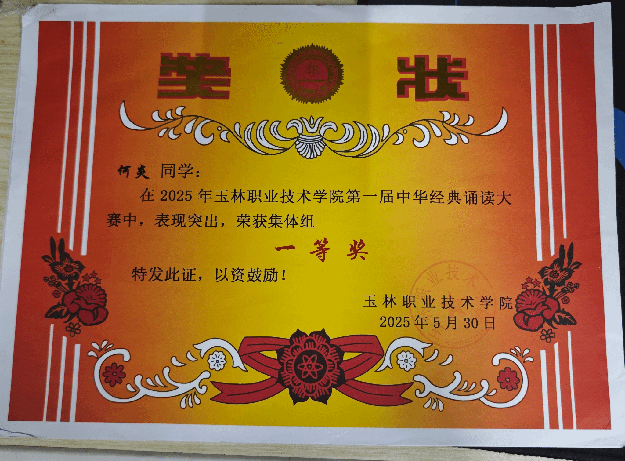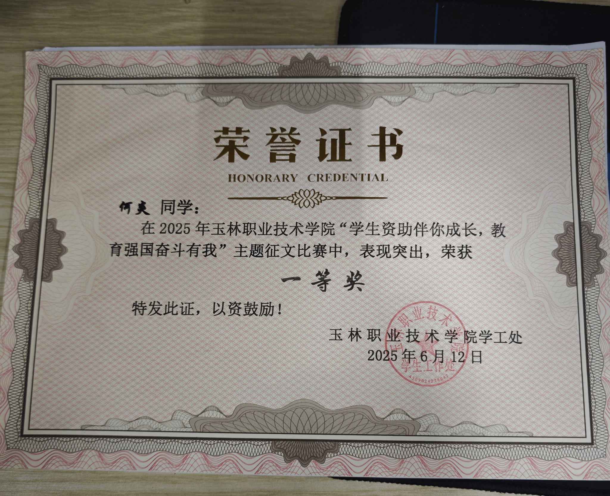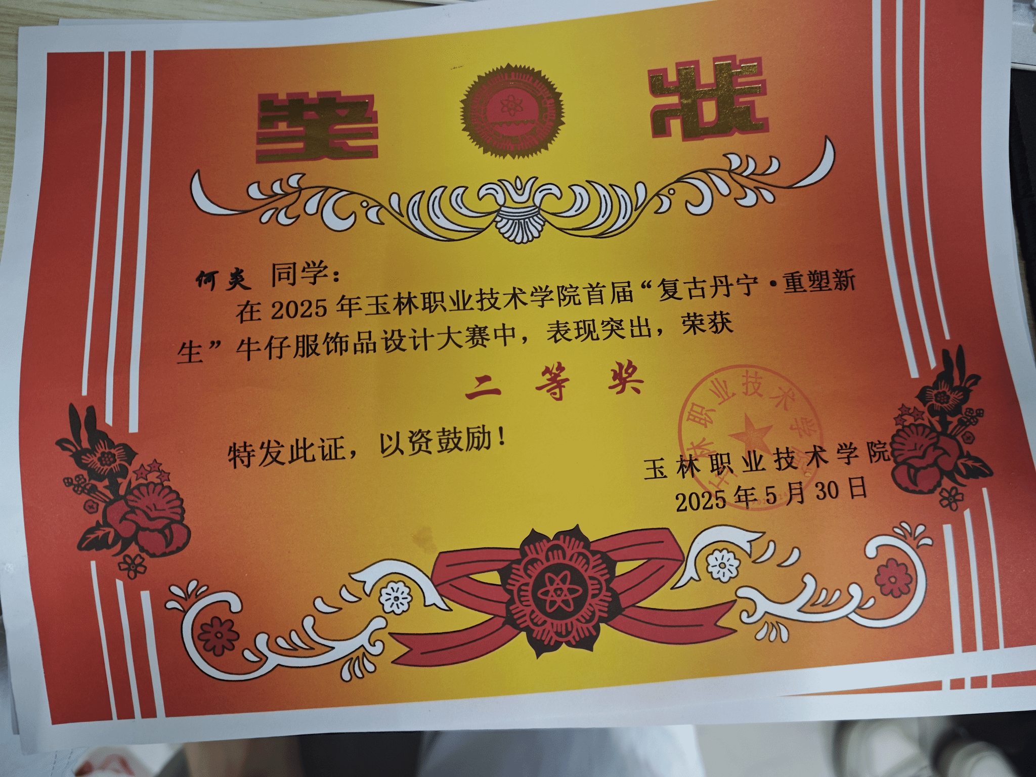 在文体与竞赛舞台上何炎同学同样大放异彩。她踊跃参与校级资助征文比赛获得校级一等奖、市级优秀奖,以真挚笔触讲述成长故事与感恩之心;在朗诵比赛中,以饱满情感、铿锵语调传递青春正能量,展现了扎实的语言表达功底与良好精神风貌,荣获校级一等奖。在2025 年一带一路暨金砖国家技能发展与技术创新大赛 AIGC+3D 时尚数字设计赛项荣获全国选拔赛二等奖。在玉职院首届“复古丹宁·重塑新生”牛仔服饰品设计大赛二等奖。为校级礼仪队成员,她严格遵守训练要求,刻苦打磨仪态举止,在学校各类大型活动中担任礼仪服务工作,以端庄得体的形象、周到细致的服务,展现了玉职院学子的文明素养,为活动的顺利开展保驾护航。