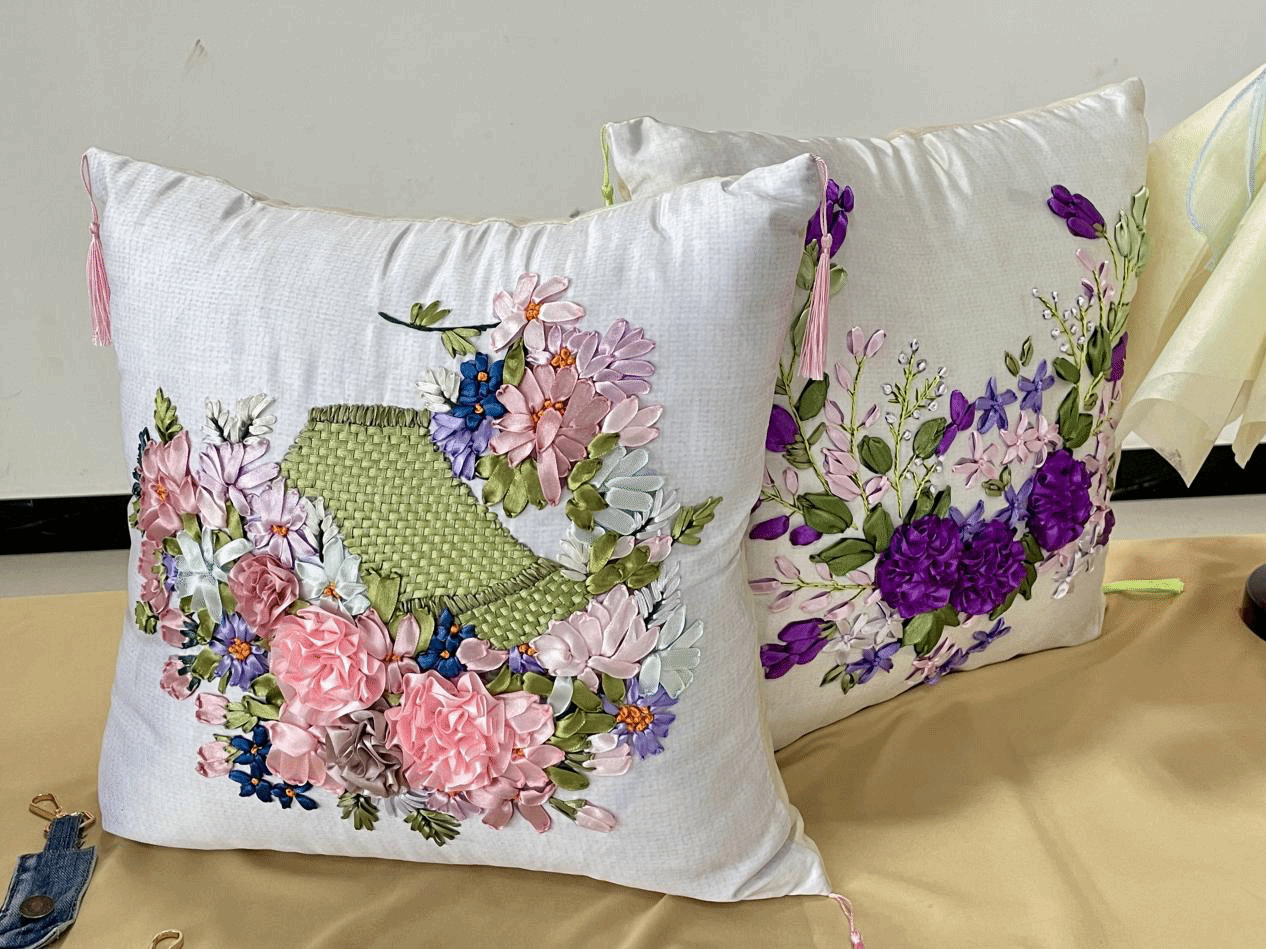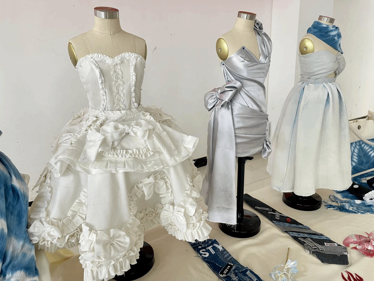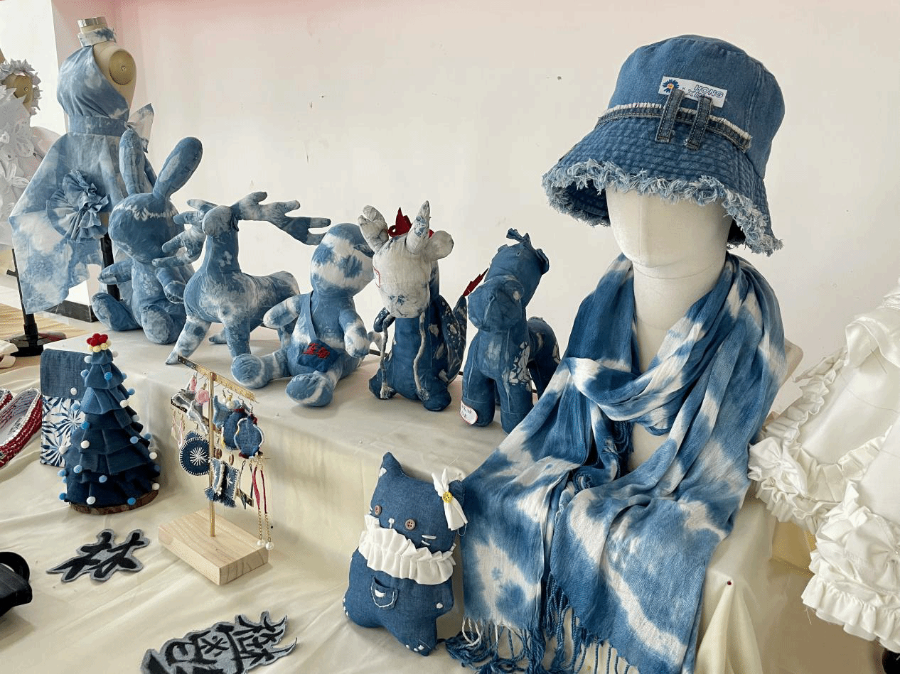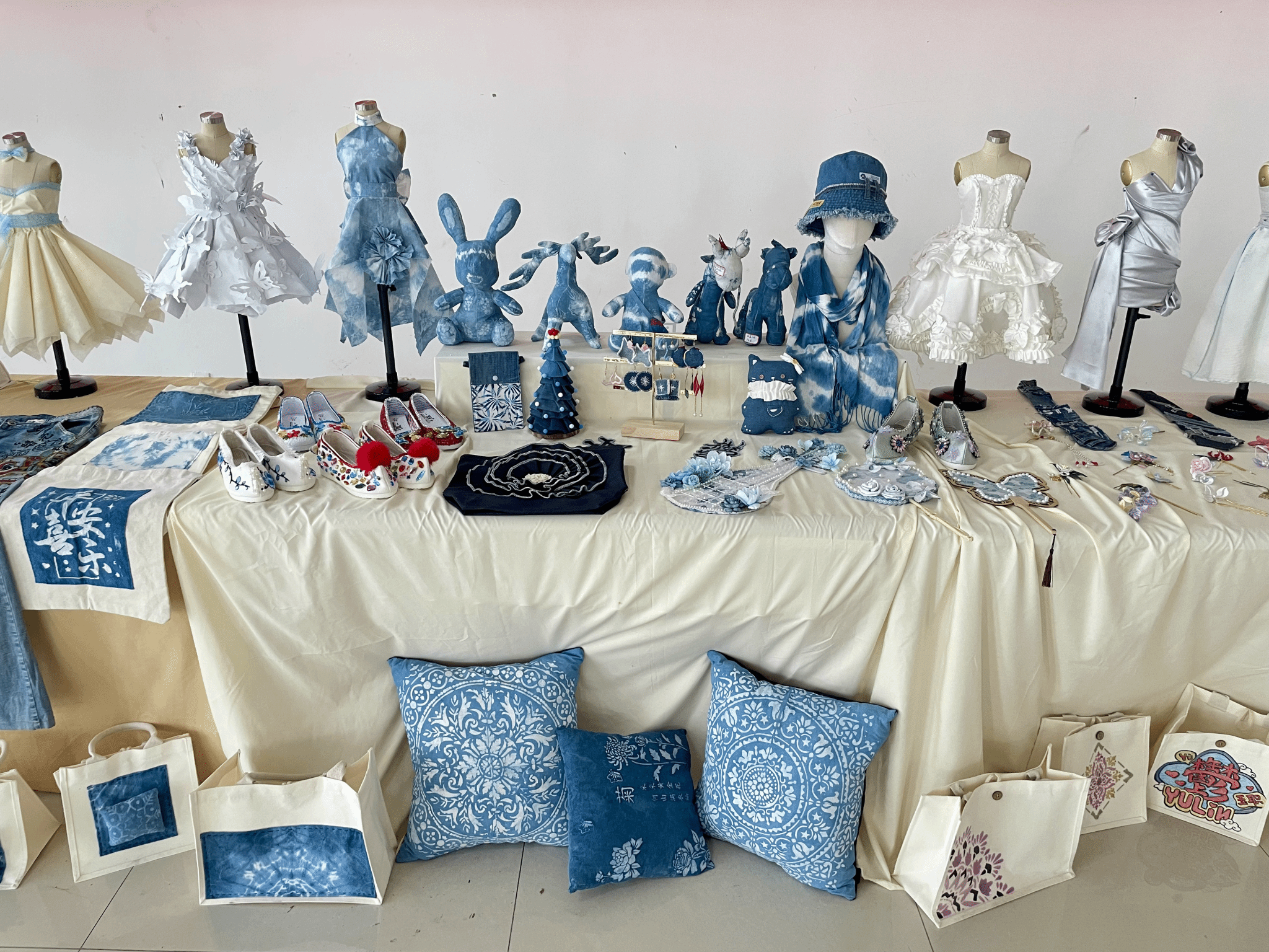 牛仔服饰品展区内,错落陈列着服装与服饰设计专业学生创作的手工刺绣、扎染、牛仔面料肌理改造、饰品制作、成衣服装等100余件作品,每件作品都凝聚着青年学子的巧思。