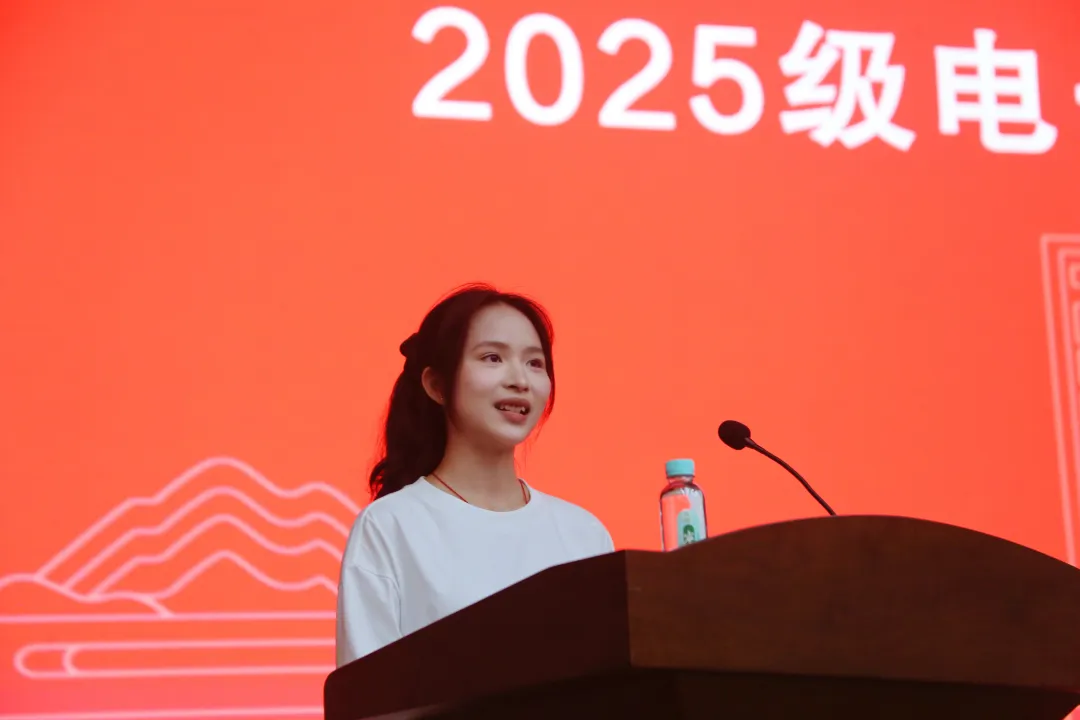 2025级电子商务专业新生赵雅敏作为新生代表发言。她称与大家怀着憧憬踏入校园,站在新起点思考未来三年成长的姿态。她提出三点思考:当下是职业教育发展的黄金时代,玉职人应靠技术立身;要践行“厚德明志 博学精技”校训,技德兼修,锚定“精技”目标;作为追梦与圆梦者,要勇担使命,让个人梦想与学校、国家未来同频共振。最后,她祝愿同学们大学时光充实美好,学院能培养出更多德才兼备的栋梁之才。