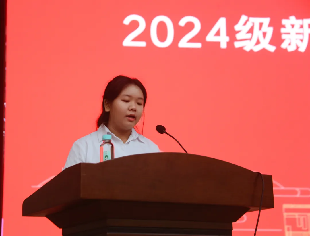 2024级新能源汽车技术专业甘秀藤同学作为老生代表上台发言。她称玉职院魅力在于“产教融合、知行合一”,在车间、直播基地等能体会学习与时代同频。校园里摄影大赛、经典诵读等活动,让兴趣有了成长路径。她建议新生先从容扎根校园,再勇敢探索。她还感谢学校搭建产业桥梁、老师耐心指引,强调辉煌源于平凡积累。最后她以“山再高,向上攀,总能登顶;路再长,走下去,必能到达”与大家共勉,愿大家成为追光者,将玉职青春过成喜欢的模样。