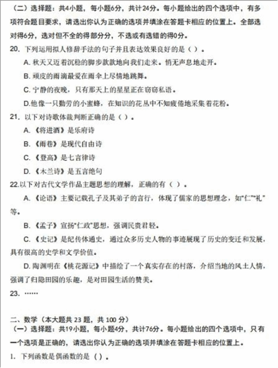 ②题型:共23道题,其中:单选题19题,每题4分;多选题4题,每题6分。