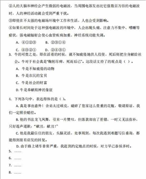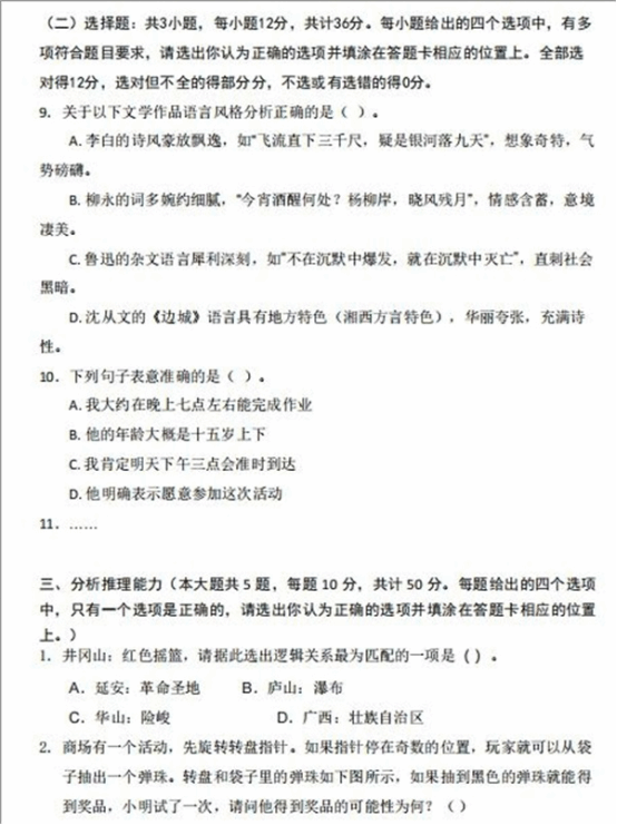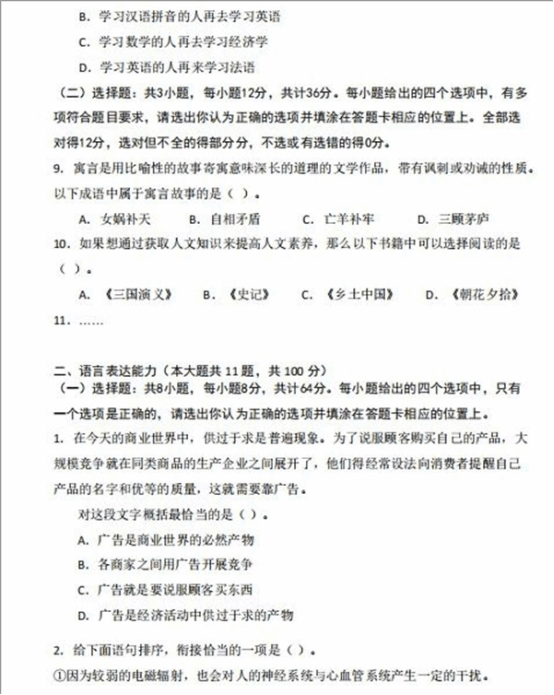 (2)语言表达能力:满分100分,共11道题。其中:单选题8题,每题8分;多选题3题,每题12分;
