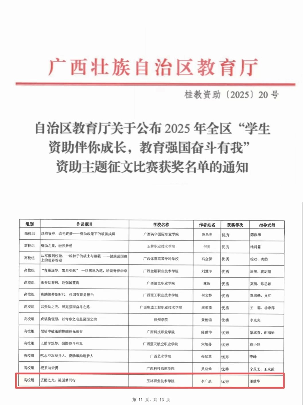 近日,2025年全区 “学生资助伴你成长,教育强国奋斗有我” 资助主题征文比赛获奖名单正式公布。我院电子商务专业2401班李广泉同学作品《资助之光,强国梦同行》凭借真挚的感情和流畅的文笔,在众多参赛作品中脱颖而出,荣获高校组优秀奖,为学院赢得荣誉。